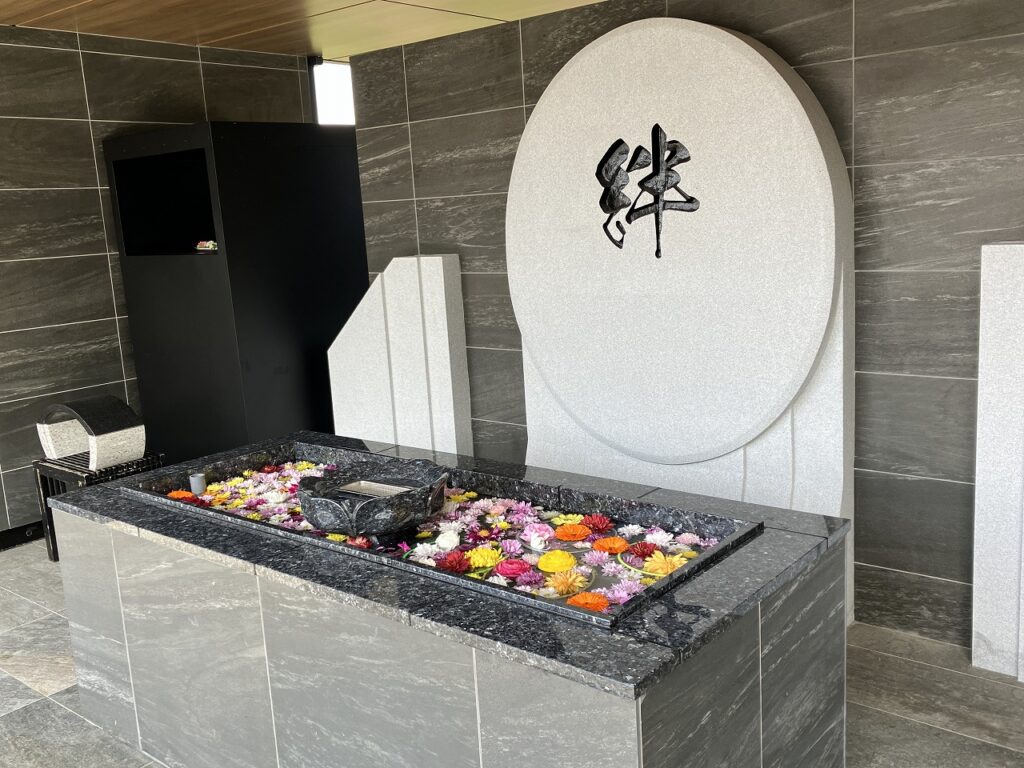 お線香の代わりに色とりどりの生花を水盤に浮かべる「花供養」。